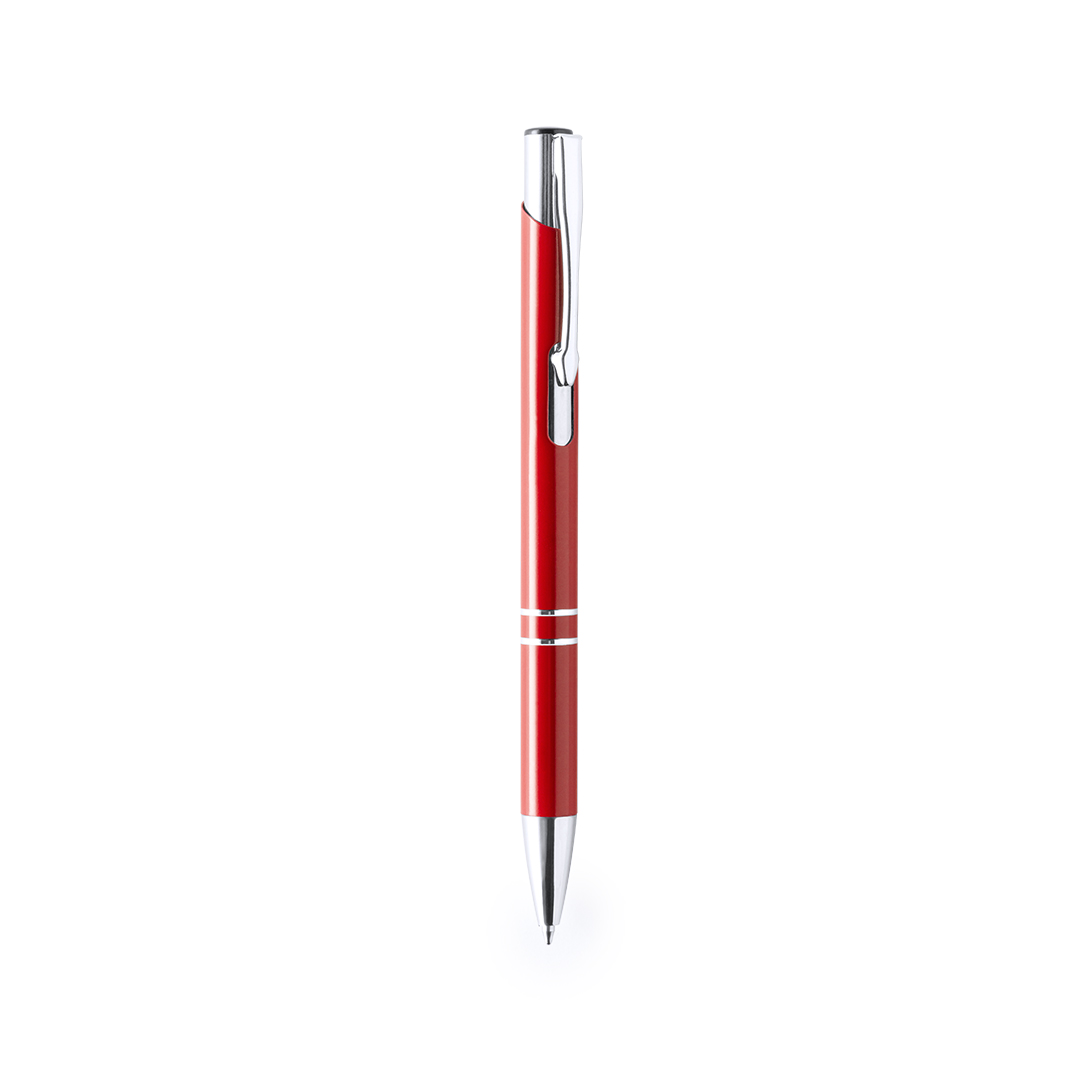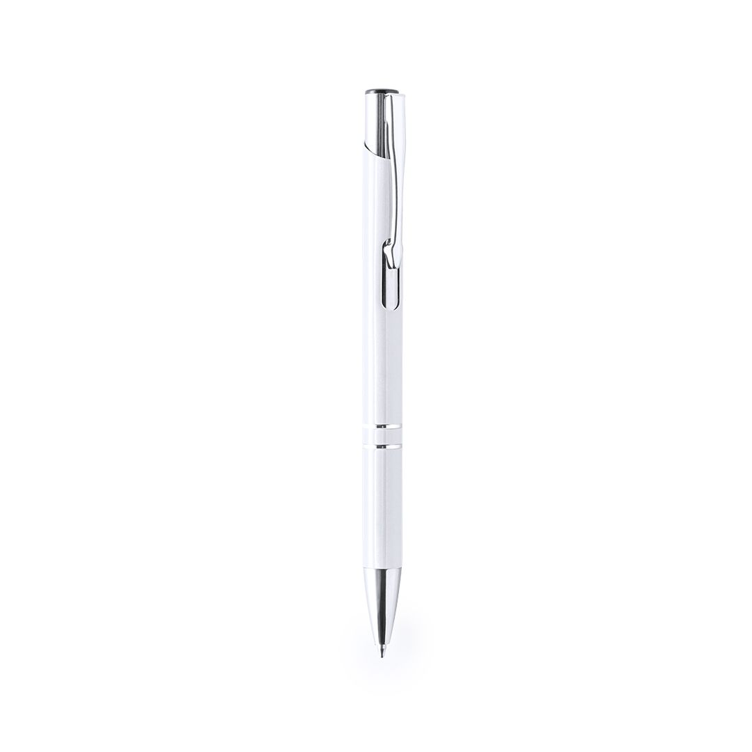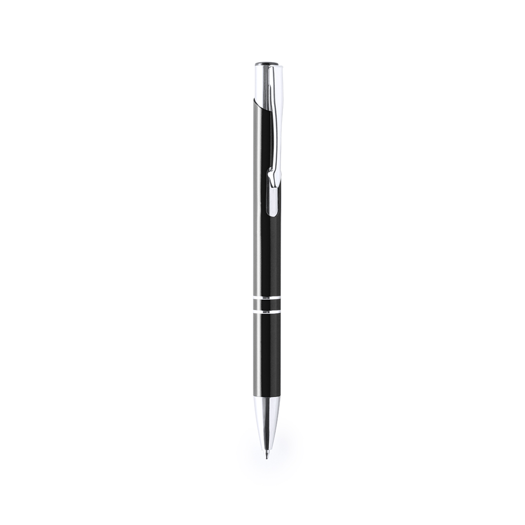 Bolígrafo con cuerpo en aluminio de acabado sólido brillante. Detalles en cromado y original muesca en cuerpo. De mecanismo pulsador, con cartucho jumbo y tinta azul.